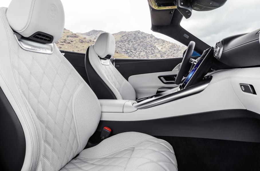 Посадочная формула нового SL — 2+2. Однако второй ряд чисто номинальный: там поместятся пассажиры ростом не больше 150 сантиметров, поэтому чаще его будут использовать для багажа. SL 43 стандартно оснащен цифровой «приборкой», комплексом MBUX с сенсорным дисплеем, сиденьями с электрорегулировкой, а также пассивной пружинной подвеской. В списке опций — полноуправляемое шасси, дифференциал с электронным управлением в задней оси, композитные тормоза, уменьшение дорожного просвета на десять миллиметров и различные варианты декоративной отделки салона, в том числе по программе manufaktur.