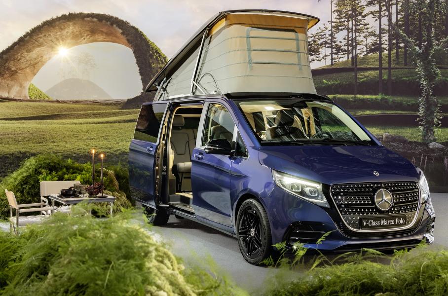 Салон, кстати, тоже изменен: тут и новая передняя панель, и руль с емкостным датчиком, следящим, чтобы руки водителя были на ободе, и два широкоформатных дисплея для EQV, V-Class и кемпера V-Class Marco Polo.