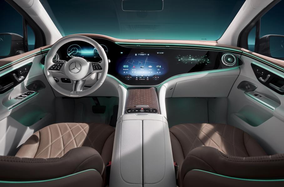 Салон нового электрического кроссовера Mercedes-Benz раскрыли на официальных фотографияхГиперэкран достанется только топовым версиям Mercedes-Benz EQE SUV, а в более простых комплектациях будут только два раздельных дисплея. В числе других особенностей оформления – фоновая подсветка по контуру панели и в дверных картах, узкая прорезь центральных вентиляционных дефлекторов и боковые дефлекторы, выполненные в форме авиационных турбин. В отделке применены натуральное дерево и алюминий.