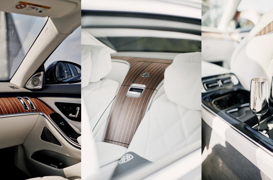 Сиденья «Майбаха» отделаны белой «наппой» с ромбовидной строчкой, а ещё кожа используется на потолке, дверях, передней панели и в отсеке под центральным дисплеем. Декоративные вставки — из шпона орешника и алюминия, что придает им сходство с палубой яхты. Седан оснастили доводчиками задних дверей, накладками на пороги Manufaktur, аудиосистемой Burmester, развлекательным комплексом для задних пассажиров и холодильником, куда поместили серебряные фужеры Robbe & Berking. Их с 2002 года предлагают как опцию, и, со слов Mercedes-Maybach, бокалы становятся все более популярными среди клиентов.