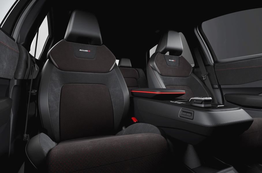В салоне установлены черные сиденья с логотипом Nismo и красной строчкой. Декор в том же оттенке применен на передней панели, центральном подлокотнике и дверных картах.
