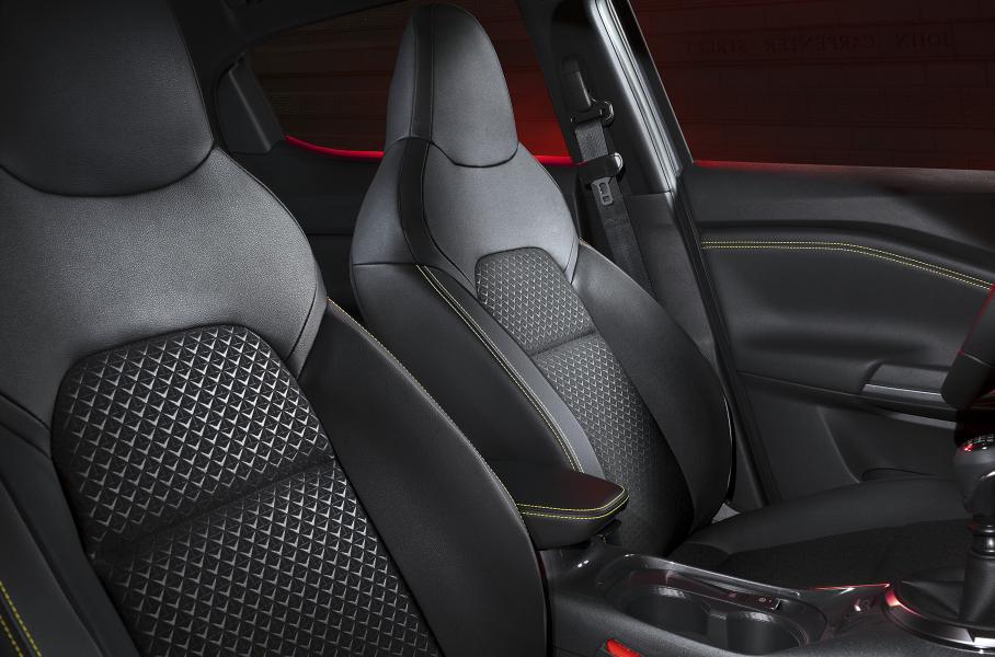Салон Juke Kiiro отделан черной тканью и серой искусственной кожей с желтой прострочкой на передней панели, сиденьях и дверных картах. В остальном он повторяет интерьер стандартного Juke с небольшим восьмидюймовым экраном мультимедийной системы и аналоговыми клавишами.