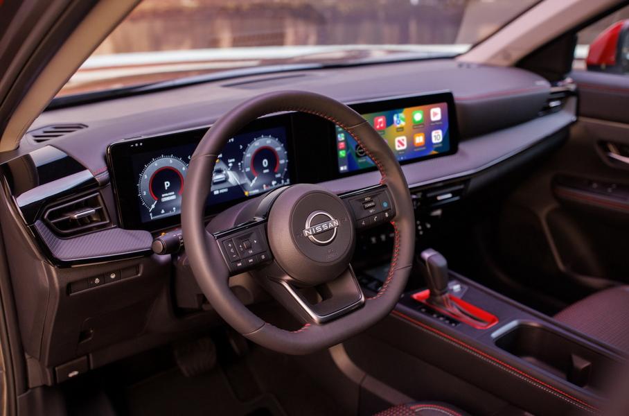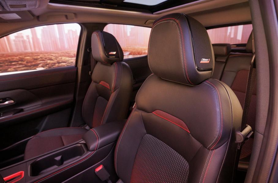 На фирменных снимках изображён Nissan Kicks в топ-версии SR: такой вариант отличается 19-дюймовыми двухцветными дисками, контрастной крышей и яркими вставками в салоне. Передняя панель с парой 12,3-дюймовых экранов, есть кожаная отделка, декоративные планки «под карбон», панорама, аудиосистема Bose, камеры кругового обзора и беспроводная зарядка для гаджетов.