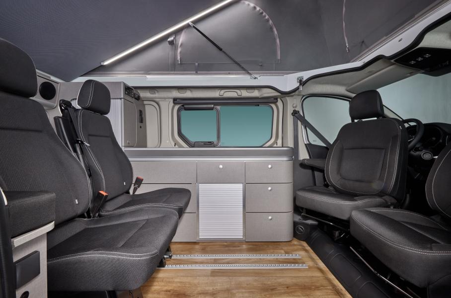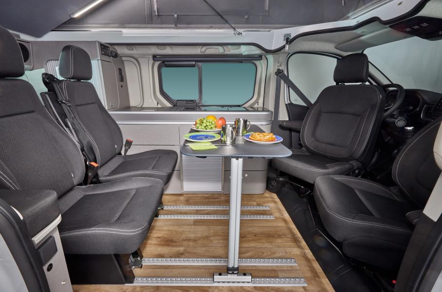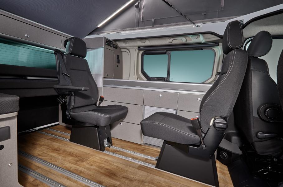 При поддержке Dethleffs фургону добавили уюта и превратили его в комфортный дом на колёсах. Внутри есть шесть раздельных кресел, четыре из которых можно двигать по своему усмотрению либо вообще убрать. Сиденья водителя и переднего пассажира вращаются на 180 градусов и вместе с раскладным столом формируют так называемую обеденную зону.