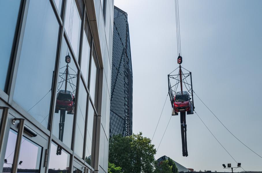 В автомобиле сидел французский гонщик и каскадер Лоран Ласко. Подняв платформу на нужную высоту, оператор крана открыл дверь «клетки» и кроссовер отправился в свободное падение. В целях безопасности Qashqai подвесили аж на восьми ремнях, что дало возможность контролировать, насколько низко и быстро машина будет падать. После того как кроссовер немного поболтался в воздухе, его благополучно спустили на землю, а официальный представитель Книги рекордов Гиннесса Прав Патель зафиксировал новый и пока единственный в своем роде рекорд.