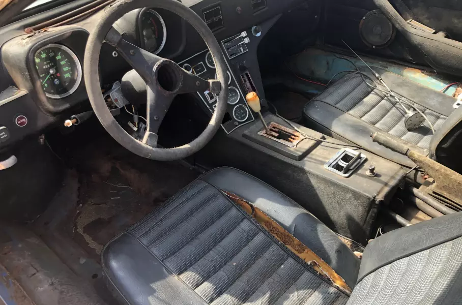 Однако этот De Tomaso Pantera принадлежит к «старой школе». Сзади у него стоит V8 5.8 c якобы четырехкамерным карбюратором Holley (на самом деле в 1972-м на «Пантеры» ставили карбюратор Autolite). Двигатель развивает 314 сил и 515 Нм момента и сочетается с механической коробкой передач. Купе оснащено передним и задним спойлером, а также 15-дюймовыми колесами Campagnolo. Всему этому требуется тщательная реставрация, ведь даже сквозную коррозию кузова видно невооруженным глазом. Пробег спорткара — 67 тысяч километров, однако неизвестно, когда он последний раз выезжал на улицу и был в сервисе.