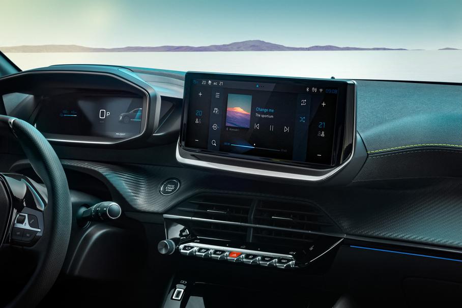 В салоне применены более качественные материалы отделки, включая черную алькантару с зеленой прострочкой за доплату для GT. Цифровая «приборка» диагональю 10 дюймов стандартна в исполнениях Allure и GT. Базовый 208 сохранил аналоговую панель с 3,5-дюймовым экранчиком, а вот дисплей мультимедийной системы i-Connect теперь 10-дюймовый во всех комплектациях. Версии с «механикой» получили новый рычаг селектора передач. У топовых 208 есть три разъема USB и более мощный отсек для беспроводной зарядки (15 Ватт вместо пяти).