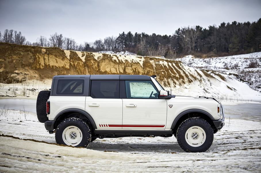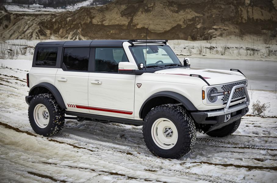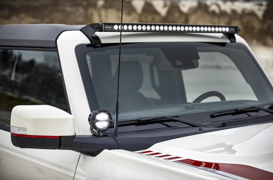 Салон внедорожника выполнен в черно-белой гамме, которую дополняют элементы красного цвета. В числе других доработок Bronco получил дополнительное освещения на крыше, запасные трубчатые двери из фирменного каталога Genuine Ford Accessories, систему крючков Molle для крепления груза, а также сейф.