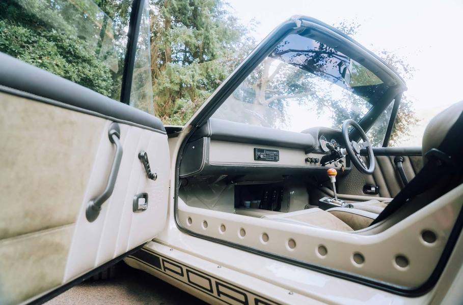Кузов спорткара изготовили из углепластика и расширили, причем под масляный радиатор пришлось поменять форму переднего бампера и капота. Фары заменили на светодиодные, прожекторного типа, и дополнили ходовыми огнями в стиле «Моби Дика» Porsche 935. Салон машины обшит кожей, установлены кресла-ковши Recaro и напольный педальный узел AP Racing, а также деревянный набалдашник рычага коробки передач. Места в ногах тут заметно больше, чем у оригинала — всё благодаря новой задней перегородке и топливному баку.
