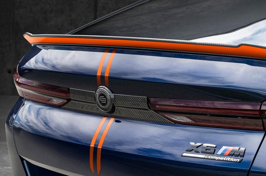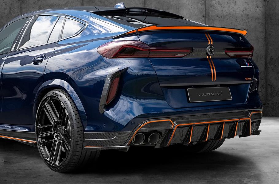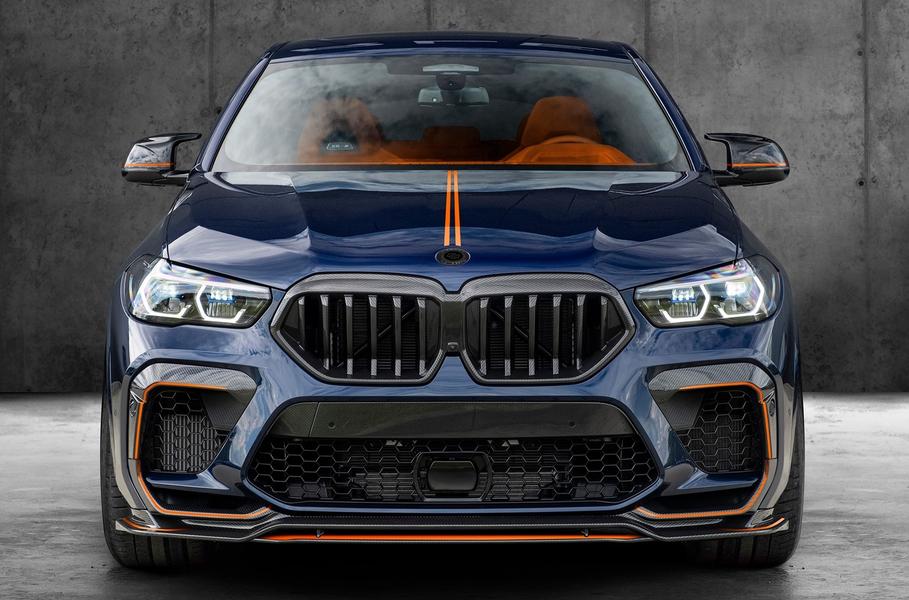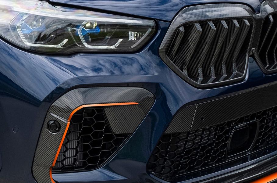 Оранжевый цвет — тот же самый, что использует Lamborghini. У итальянцев такой оттенок называется Arancia Leonis. Его также же можно увидеть на акцентах по всему кузову X6 M — от сплиттера до боковых юбок, спойлера и диффузора, — причем всё это удачно сочетается с основным тёмно-синим колером, похожим на «Синий танзанит» из палитры BMW Individual.