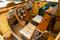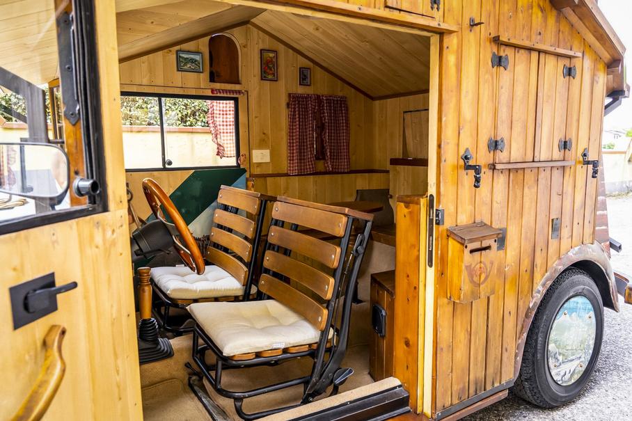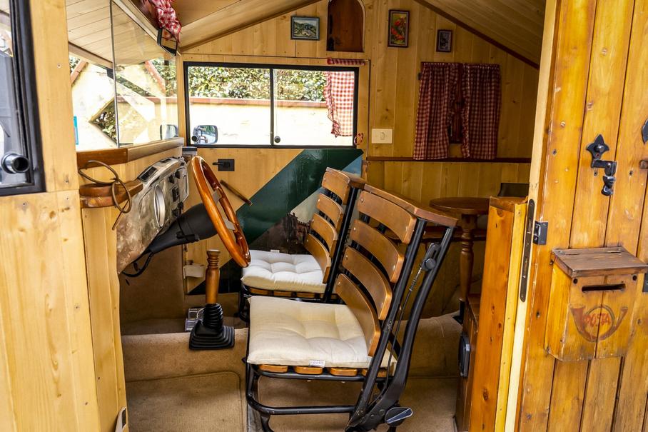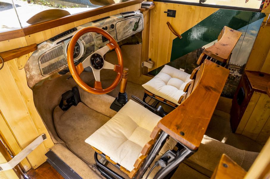 Пробег необычного автодома составляет 73 000 километровВ салоне Holzhaus расположен диван, обеденный стол, мини-кухня с газовой плитой, а также полноценные окна с занавесками и ставнями. Вместо традиционного руля в машине установлено деревянное колесо, а селектор переключения передач заменяет перевернутая ножка стола. Кроме того, интерьер самоходной избушки украшен несколькими картинами и часами с кукушкой.