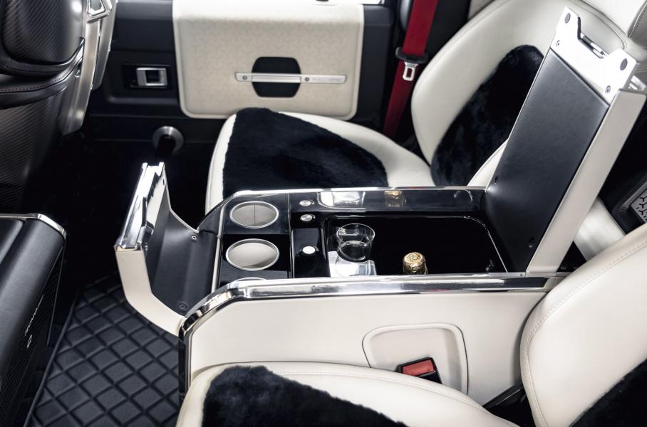 В салоне Land Rover Q40 появились сиденья-ковши, выполненные из натуральной кожи черно-белого цвета, карбона и вставок из овчины. Кроме того, интерьер дополнен стеганым потолком и новым рулевым колесом.