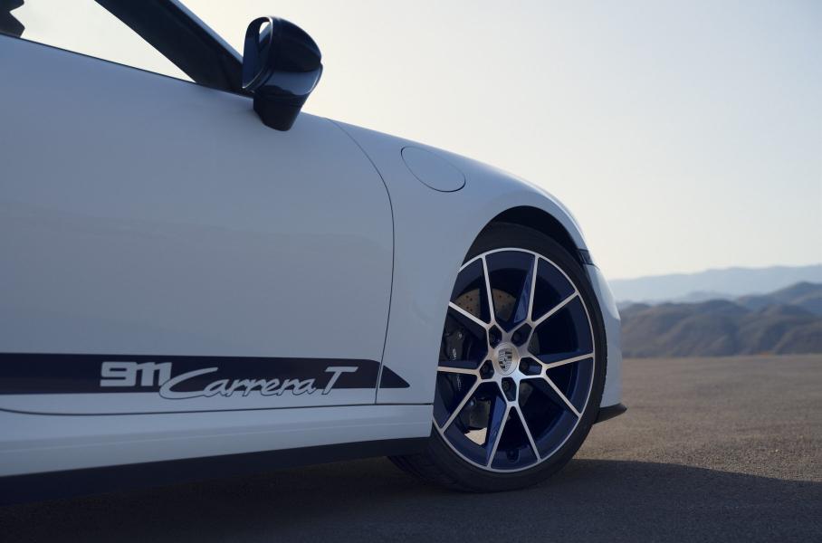 Что касается управляемости, то 911 Carrera T получил адаптивную подвеску PASM с уменьшенным на 10 мм клиренсом и своими особыми калибровками, полноуправляемое шасси (раньше это была опция) и более «острую» рулевую рейку. Разновеликие колёса диаметром 20 дюймов спереди и 21 дюйм сзади заимствованы у версии «S», но по заказу доступны и другие колёса из линейки Exclusive Manufaktur (в том числе с углепластиковыми колпаками).