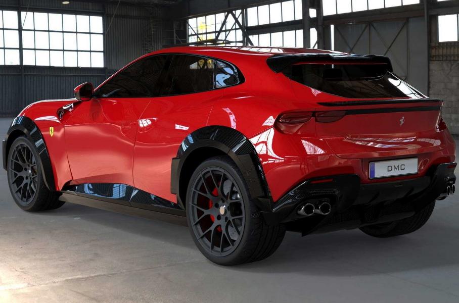 Долгожданную новинку Ferrari готовы украсить карбоновым обвесомСпециалисты DMC готовы предложить расширители колёсных арок, которые увеличивают габаритную ширину на три сантиметра. Ещё в комплект входят боковые юбки, накладки на бамперы, пара спойлеров на пятую дверь, а также матовые кованые диски DMC Velocita с семью Y-образными спицами.