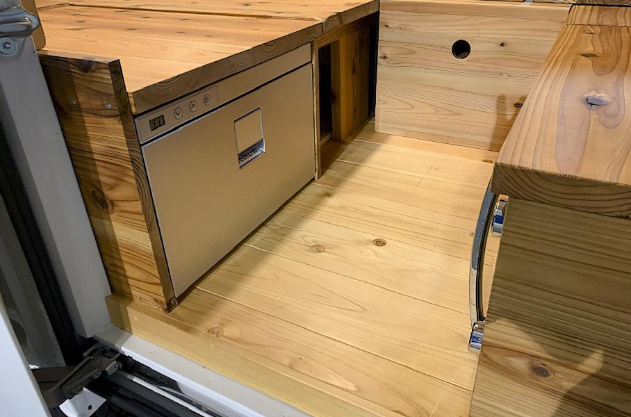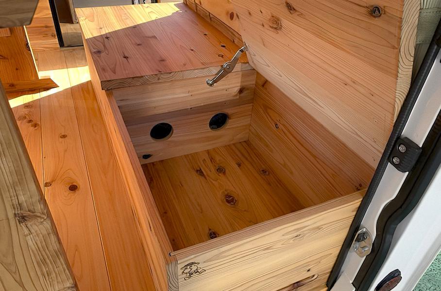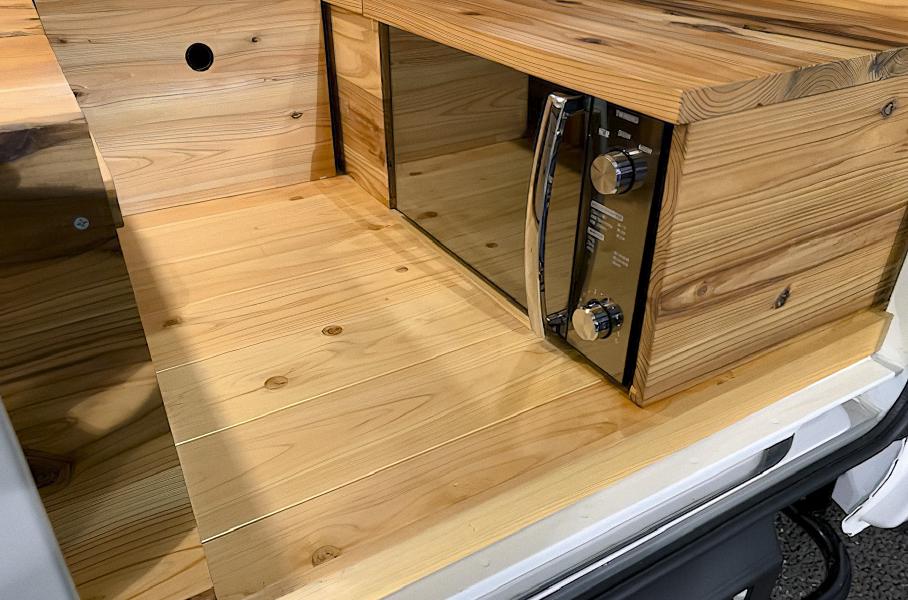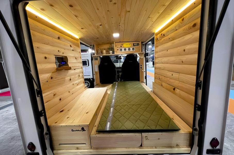 Что касается оборудования, то внутри Quokka имеются 16-литровый холодильник и микроволновая печь, скрытые под деревянными досками, которые обеспечивает электричеством аккумулятор на 100 ампер-часов. Также в список входят розетка, USB-входы и нагреватель.