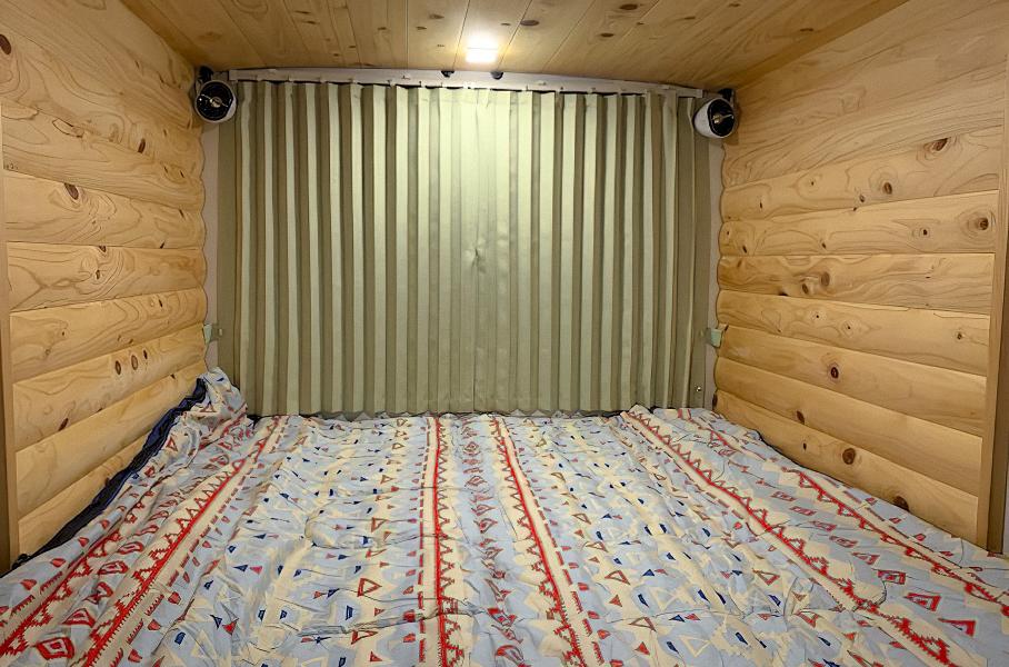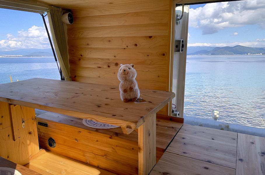 Внутри есть только одна универсальная зона, пол которой ночью превращается в кроватьСнаружи Quokka выглядит как обычный грузовичок Daihatsu Hijet с жилым модулем. Самое интересное находится внутри: пол, крышу, и стены пространства его создатель Мисима Дайхатсу отделал натуральным деревом.