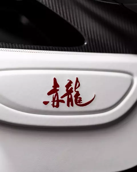 В салоне доминирует белая кожа, которая украшает сиденья, дверные панели, стойки и тоннель трансмиссии, а другие части дверей и центральная консоль выполнены из матового углеродного волокна. Повсюду встречается множество красных акцентов, в том числе на зеркале заднего вида, прострочке сидений и вышитых логотипах.
