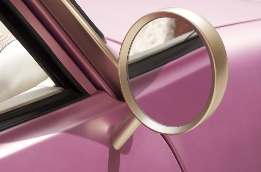 Базовый слой здесь розовый, поверх которого нанесены золотистые пигменты и «заиндевевший» матовый лак. Именно такое сочетание позволяет краске ярко блестеть на солнце и уходить в синеву с наступлением сумерек.