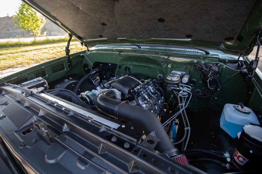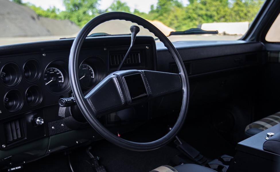 Усиленный каркасом безопасности в салоне кузов получил интерьер под стать внешности. Салон отделан чёрной кожей и клетчатой тканью, оснащён сиденьями Relicate и современной мультимедийной системой. Технически рестомод K5 Blazer не имеет ничего общего со своим оригинальным вариантом, поскольку под капотом появился 430-сильный V8 семейства LS3.