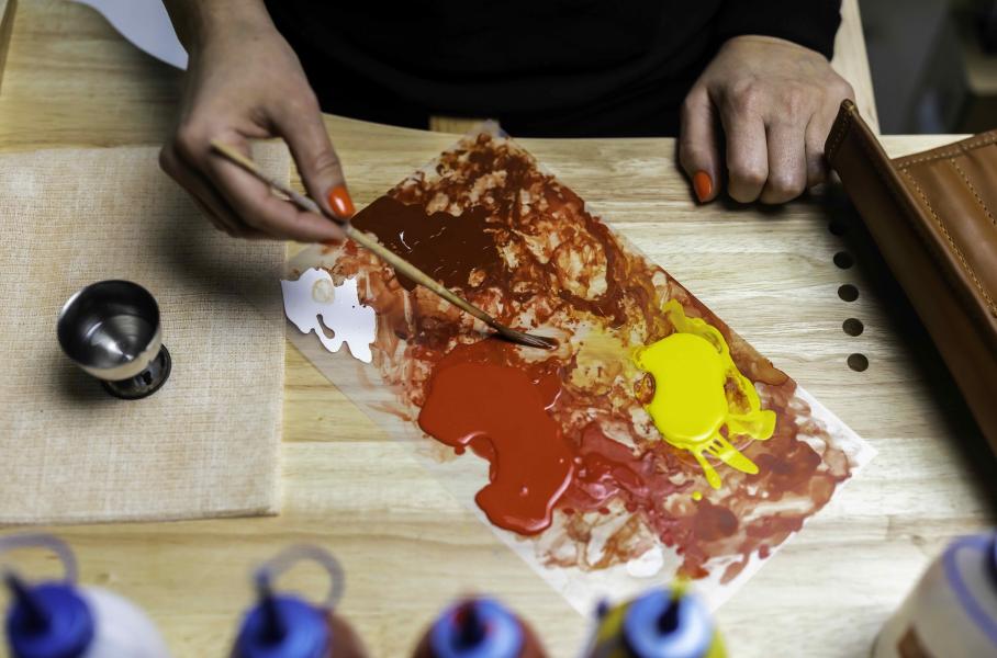 Рисунок наносят в несколько этапов, и занимает это больше двух недель. Дракон состоит из нескольких слоев, причем базовый выполнен в технике «растушевки» (feathering) для придания «эффекта пламени». Всего слоев четыре, и для каждого подобран индивидуальный оттенок красного. После нанесения слои тщательно очищают, шлифуют и покрывают лаком — так изображение становится объемным и приобретает вид гравировки.