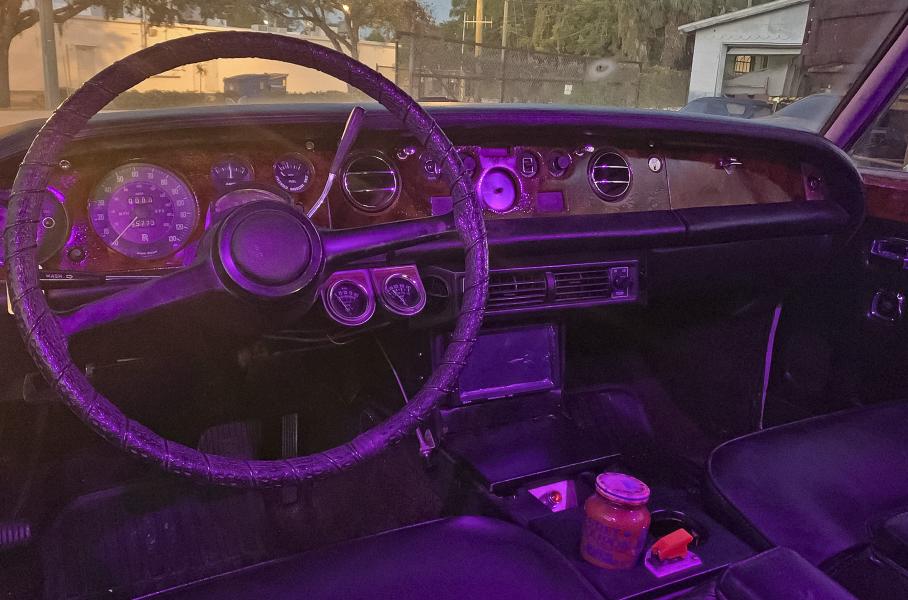 Салон премиального тягача остался практически без изменений. Салон выполнен из черной кожи, которая сочетается с деревянной отделкой торпедо и дверных карт. Единственным дополнением стала фиолетовая атмосферная подсветка. Кроме того, грузовой пикап оборудовали передними колесными дисками с шипами. Таким образом владелец автосалона исполнил свою мечту – перевозить премиальные Rolls-Royce и Bentley на другом Rolls-Royce.