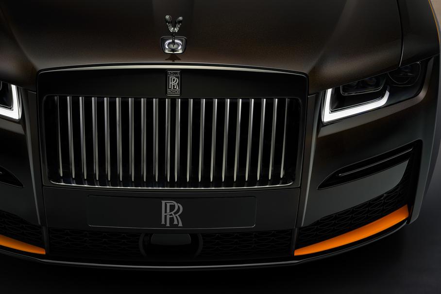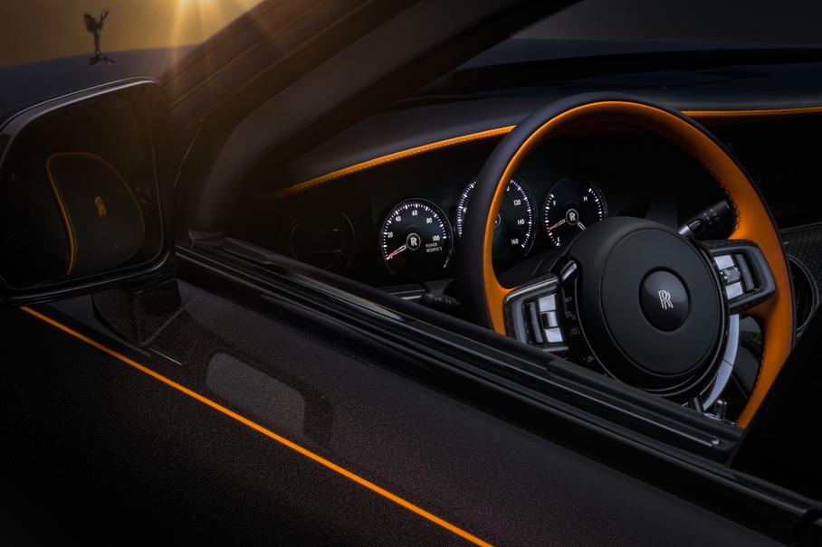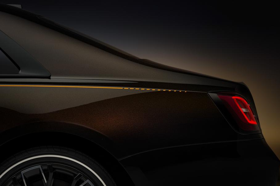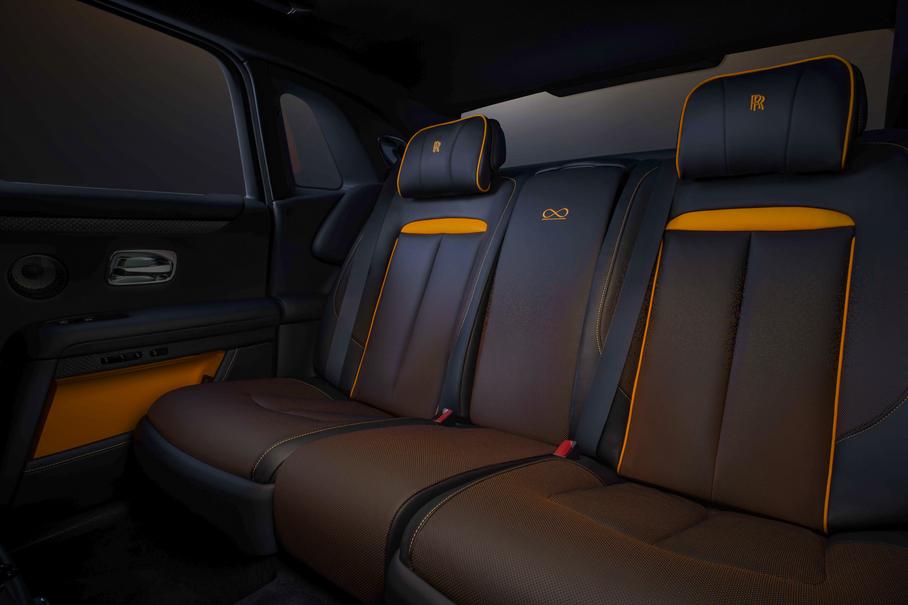 Экстерьер особого Ghost выкрашен в темно-коричневый колер Lyrical Copper, подчеркнутый оранжевыми акцентами. Оранжевый цвет проходит лейтмотивом и в салоне: он виден на передней панели, порогах, дверных картах и сиденьях. Кожа на креслах окрашена таким образом, что оранжевый проглядывает сквозь более чем 200 тысяч перфораций, имитируя сумеречное освещение и создавая эффект глубины.