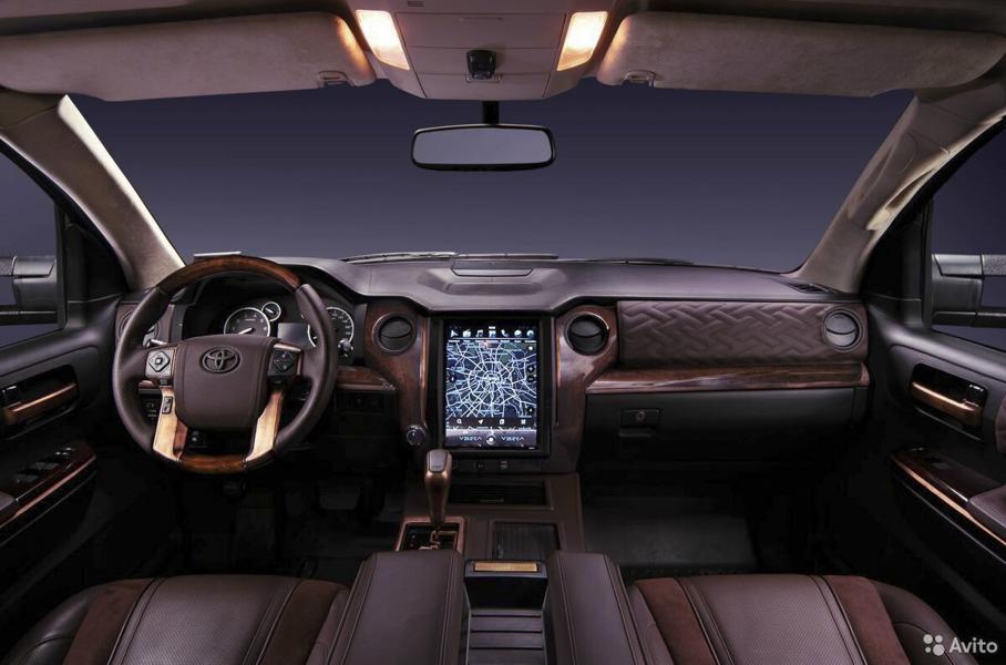 Экстерьер Tundra отличается композитными силовыми бамперами и радиаторной решеткой, на которую установили четыре светодиодных прожектора. Кроме того, дополнительное освещение появилось на крыше. Салон внедорожника обшили коричневой кожей Nappa и дополнили интерьер элементами отделки из меди. На торпедо появился 12,1-дюймовый вертикальный сенсорный дисплей, похожий на те, что устанавливают в электрокары Tesla.