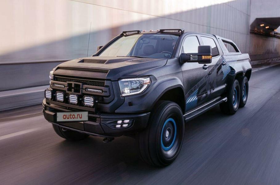 В Москве в продаже появился шестиколесный пикап Toyota Tundra с трехметровой грузовой платформойМодифицированный пикап разработали инженеры российского тюнинг-центра «4х4 Tundra». Автомобилю нарастили раму, добавив еще одну ведущую ось, добавили лифт-комплект подвески, кованые колесные диски с 38-дюймовыми внедорожными покрышками, а также пневмоподвеску, управлять которой можно из кабины машины. При этом размеры грузовой платформы увеличили практически до трех метров.