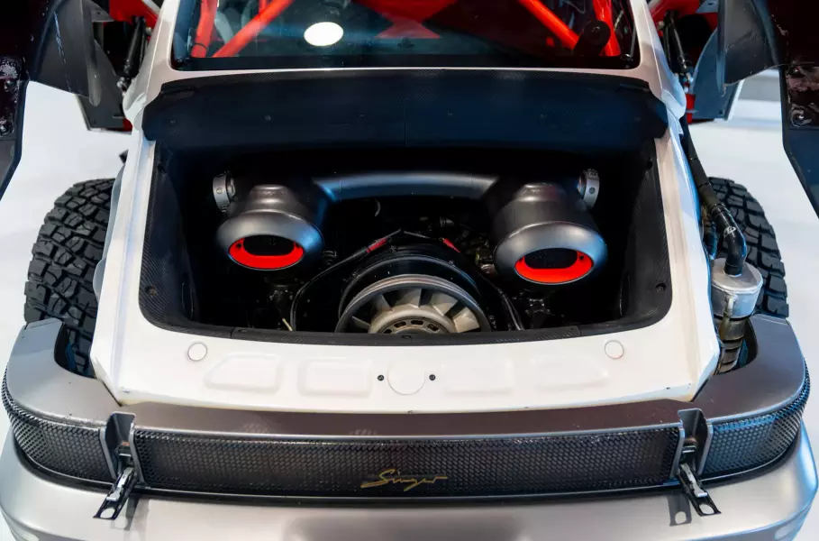 Двигатель — оппозитная «битурбошестёрка» 3.6 (456 л.с., 569 Нм); привод постоянный полный, с тремя дифференциалами. Тяга на колёса идёт через пятиступенчатую секвентальную коробку с возможностью управления рычагом и подрулевыми лепестками, причём переходить на высшую передачу можно без выжима сцепления. В оснащение Singer ACS также входят GPS-трекер, топливный бак увеличенного объёма, отсеки для двух полноразмерных запасок и система подачи воды для водителя и штурмана.