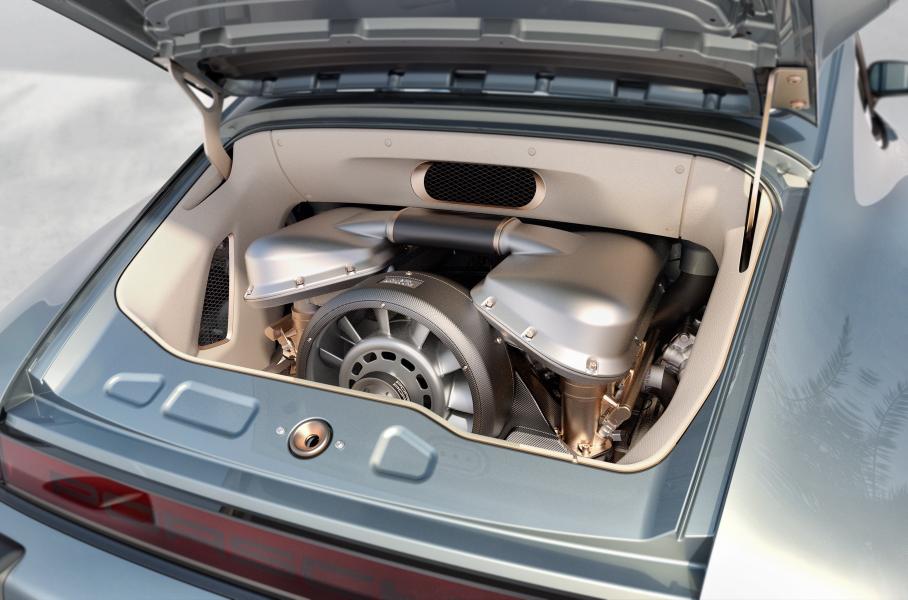 Двигатель Turbo Study — очередная итерация оппозитной «шестерки» Ханса Мецгера, легендарного моториста Porsche. Агрегат объемом 3,8 литра оснащен двумя турбокомпрессорами BorgWarner от нынешнего «911-го» и электронноуправляемыми перепускными клапанами, а выдает как минимум 450 сил и 542 Нм момента. По просьбе заказчика отдачу, конечно же, могут и нарастить, плюс добавить спортивный выпуск.