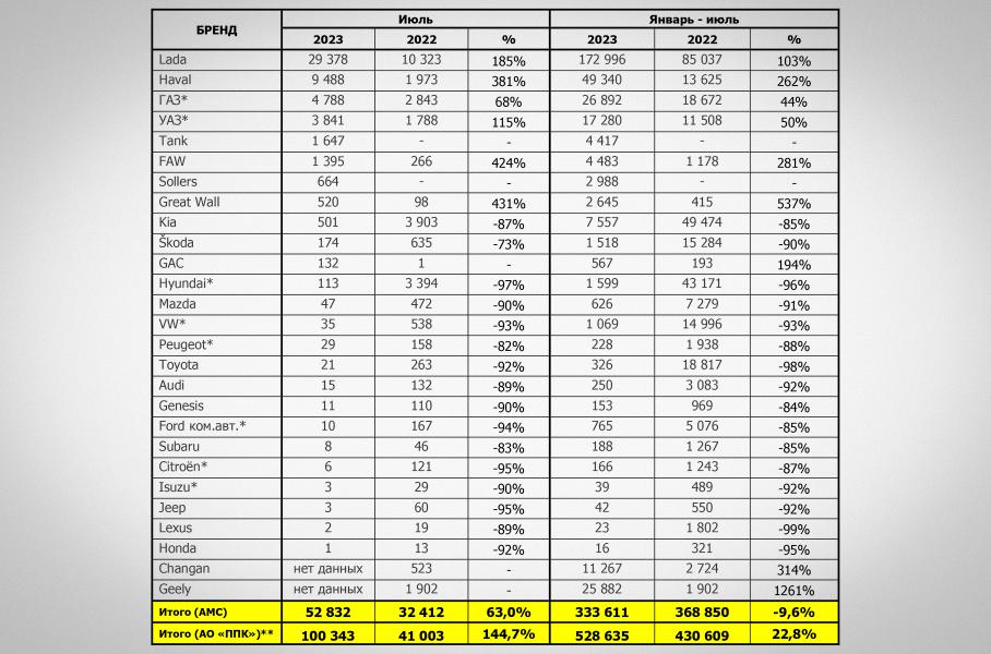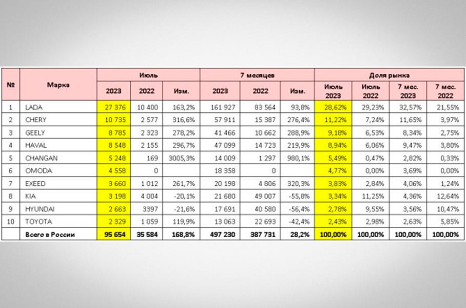 Около половины (49 процентов) реализованных в июле машин приходится на три марки: Lada, которая заняла долю рынка в 29 процентов, продав 27,4 тысячи машин, Сhery, доля которой составила 11 процентов, а продажи — 10,7 тысячи штук, и Geely (доля — девять процентов, продажи — 8,8 тысячи штук).