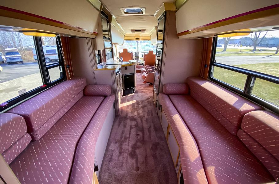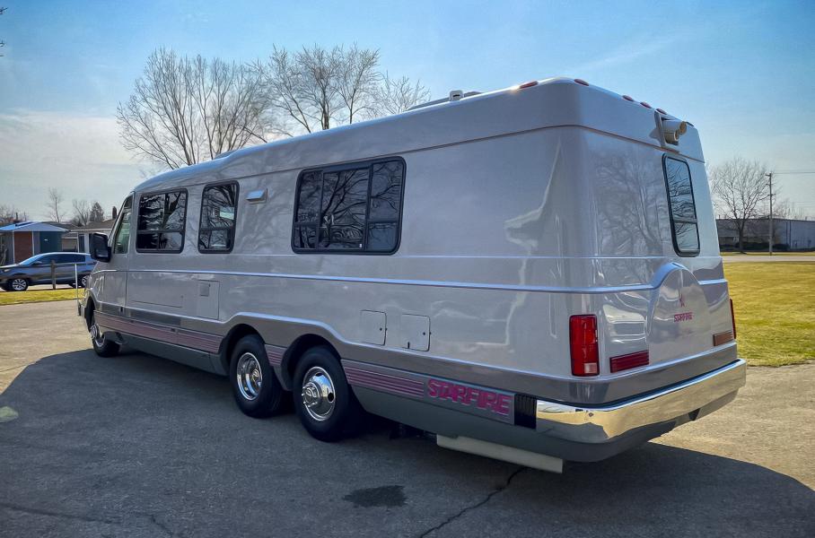 В салоне дома на колесах есть все что нужно, для длительных путешествий. Интерьер Eldorado Starfire оборудован двумя изогнутыми диванами, которые раскладываются в кровать, несколькими раздельными креслами, а также столиками, полноценной кухней с плитой, холодильником микроволновкой и мойкой. Кроме того, в оснащение входит кондиционер, центральная система обогрева и бортовой генератор. Под капотом машины находится 7,5-литровый V8, отдача которого составляет 245 лошадиных сил. Агрегат укомплектован автоматической трансмиссией.