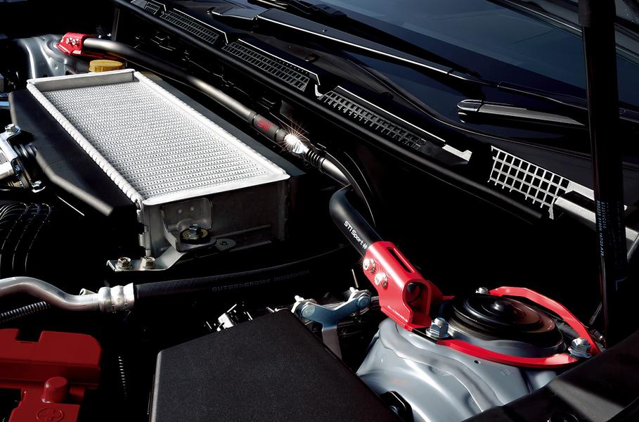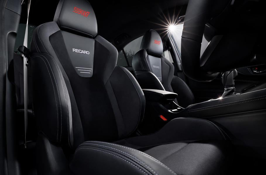 В основном ничего примечательного: глянцевая черная решетка радиатора, корпуса боковых зеркал, антенна на крыше, спойлер и шильдик WRX S4. В салоне — кресла Recaro c комбинированной отделкой (кожзам + искусственная замша Ultra Suede), декоративная серебристая прострочка и разнообразные мелочи. Двигатель — штатная для японского WRX «турбочетверка» 2.4 с отдачей 275 лошадиных сил и 375 Нм крутящего момента. Привод у STI Sport# полный, коробка передач — вариатор Subaru Performance Transmission.