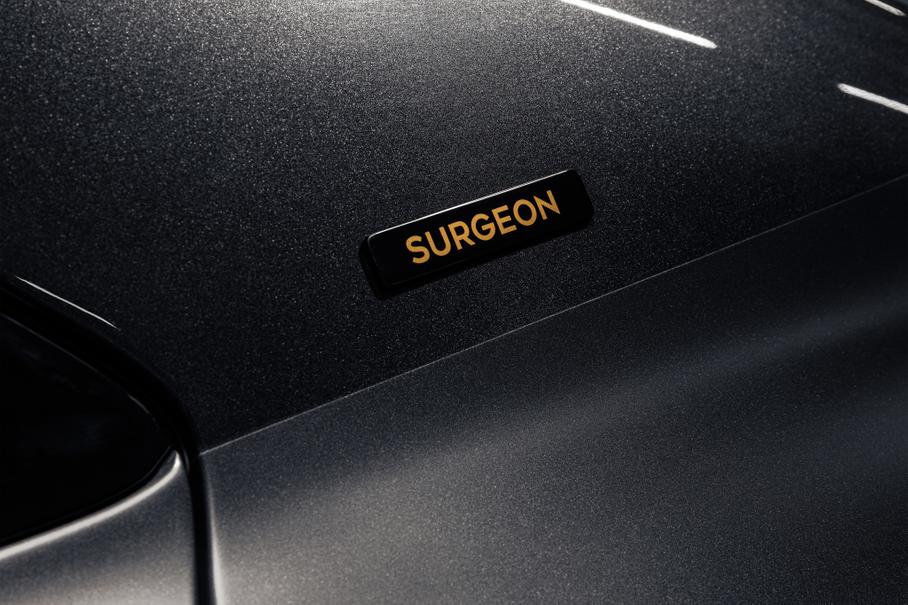 На задней стойке кузова появилась фирменная эмблема The Surgeon и она же — изображение черепа в маске с перекрещенными под ним скальпелями — проецируется на землю при открытии дверей. В салоне аналогичный логотип вышит на подголовниках сидений и выгравирован на шпоне грецкого ореха, которым украшена передняя панель. Салон отделан сочетанием белой Linen и чёрной Beluga кожи с прострочкой нитью цвета Bronze, а напоминание об авторе проекта встречается на порогах и приборной панели.