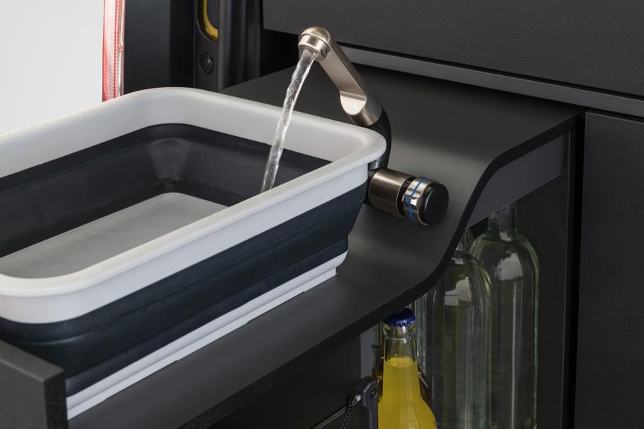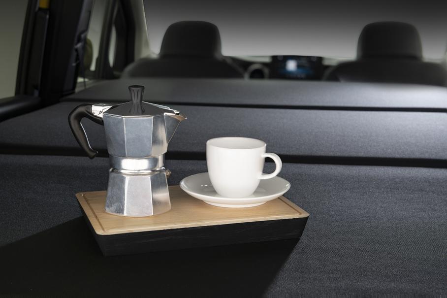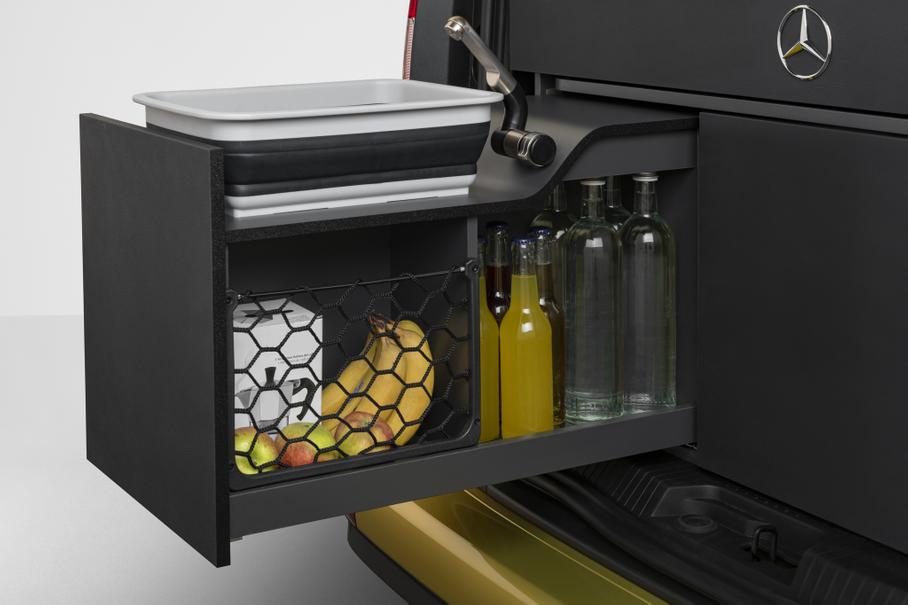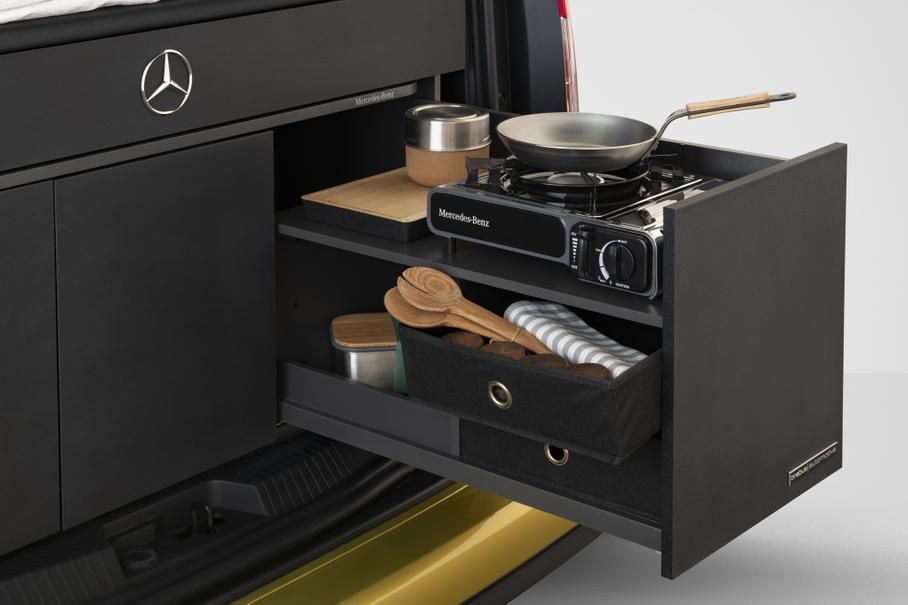 За доплату автомобиль можно будет дооснастить кухонным модулем, который устанавливается в багажник. Гарнитур с несколькими выдвижными ящиками имеет раковину с 12-литровым резервуаром для воды, 15-литровый холодильник и газовую плиту, а также шкафы для столовых приборов, посуды и продуктов.