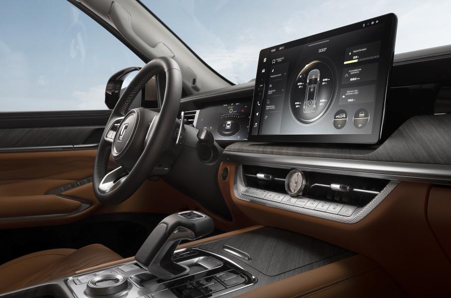 В салоне установлен 14,6-дюймовый экран мультимедийной системы: управление основными функциями осуществляется либо с него, либо с помощью дублирующих физических клавиш. В списке оснащения заявлены трехзонный климат-контроль, кожаные кресла с функциями массажа, подогрева и вентиляции, адаптивный круиз-контроль и светодиодные фары с автоматическим управлением дальним светом.