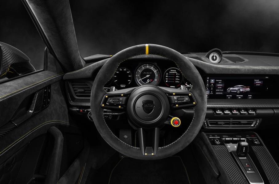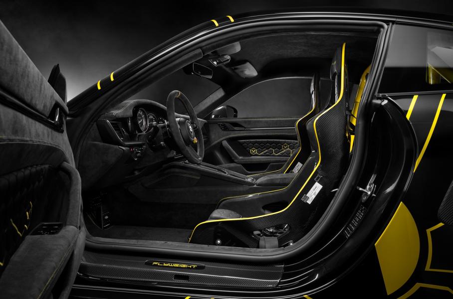 Как результат, до первой «сотни» купе разгоняется за 2,5 секунды (у обычного 911 Turbo S — 2,8 с), до 200 — за 7,5. Максималка превышает 350 километров в час, хотя у исходника ограничитель срабатывает на 330.