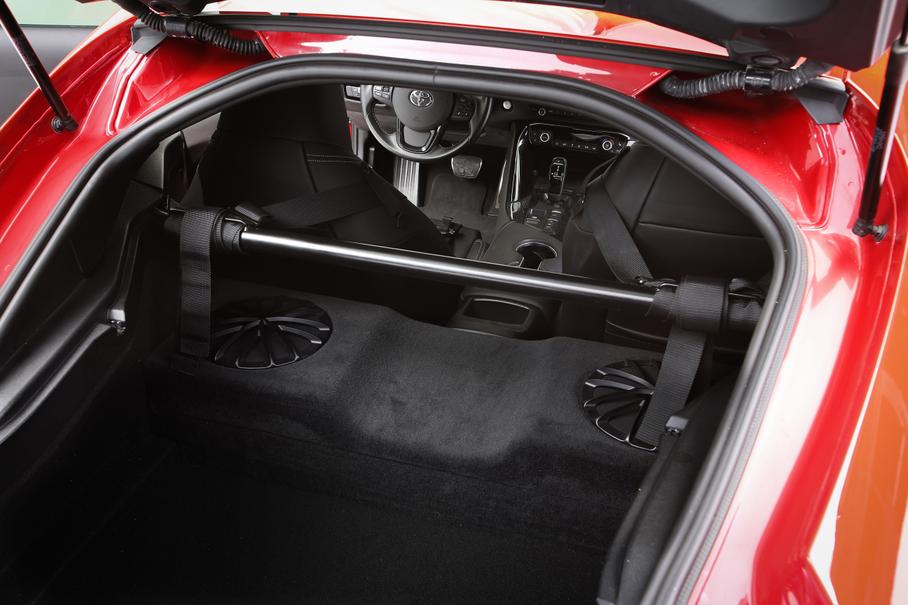 Кузов дополнительно усилен распорками из каталога Toyota GR и оснащен карбоновыми элементами обвеса от HKS и углепластиковым капотом Seibon. Дополняют дизайн белые колёса Motegi Racing MR154 Battle с шинами Yokohama Advan, светодиодная подсветка Type S и ливрея в стиле машин Formula Drift. В салоне же появились каркас безопасности Studio RSR, гоночное сиденье Sparco EVO QRT и шеститочечные ремни безопасности этого же бренда, руль Vivid Racing VR Bespoke и рычаг коробки передач с укороченным ходом.