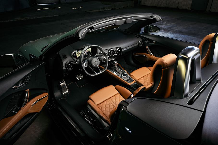 В основе спецверсии — TT S Line, но большую часть значков с указанием комплектации с кузова и интерьера убрали. В салоне применено углеродное волокно, сиденья обиты натуральной кожей Palomino Brown, которая, как указывают дизайнеры, отсылает к креслам оригинального спорткара.
