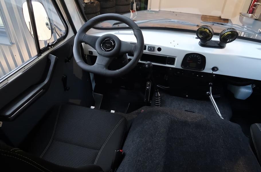 К тому же «Буханка» оборудована подогревом передних сидений, усилителем руля, камерой заднего вида и защитой днища. Задние стекла тонированы, а колеса выкрашены в белый цвет. Среди других улучшений: усиленная антикоррозийная обработка, удлиненное на 10 сантиметров кресло водителя, новый термостат и модернизированная система кондиционирования воздуха.