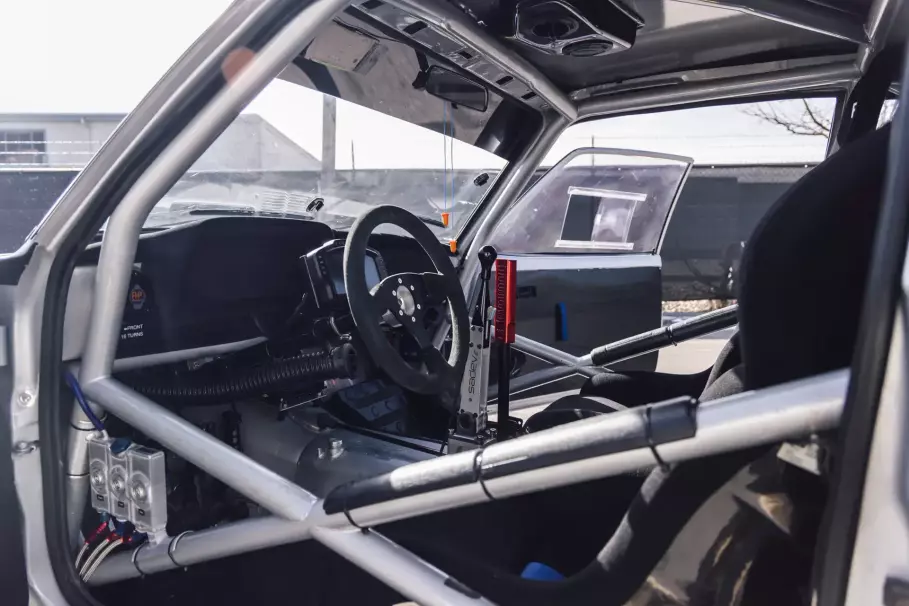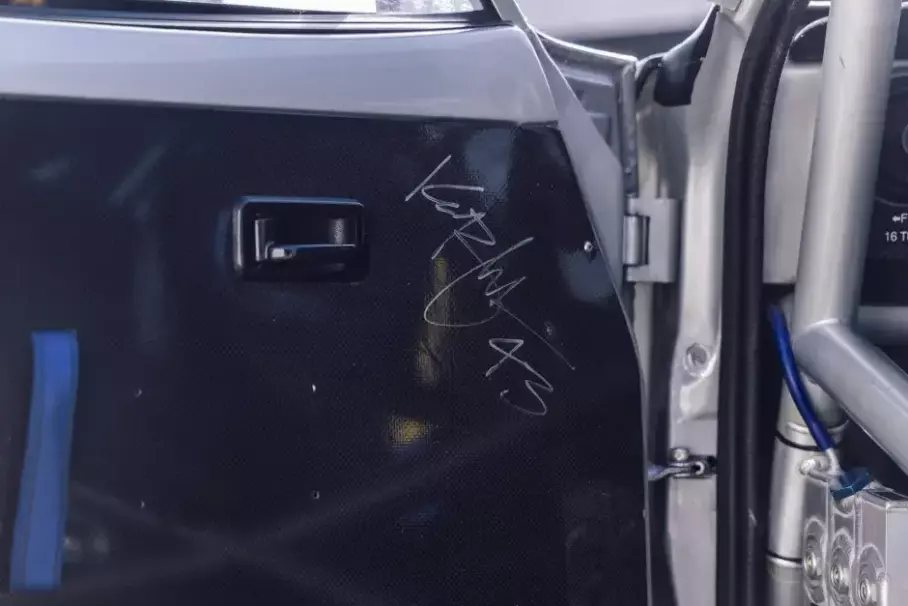 Масса автомобиля составляет всего 906 кг. Салон полностью утилитарен: два ковша Recaro, новая приборная панель, руль Sparco и подпись самого Кена Блока на дверной карте.