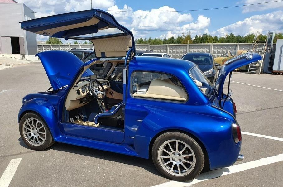 Автомобиль может выезжать на дороги общего пользованияОт «восьмерки» самодельной машине достался мотор, коробка передач, а также ходовая часть и рулевое управление. Кроме того, владелец установил кастомную выхлопную систему, 30-литровый бензобак из нержавеющей стали и 15-дюймовые колесные диски. Внешне напоминает советский «Запорожец» лишь «горбатый» кузов. Однако и его хозяин расширил, усилил и полностью перекрасил. Так же у модели появились подъемные двери типа «крыло чайки».