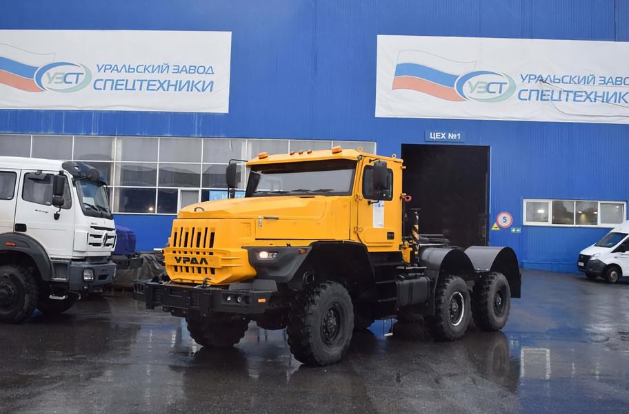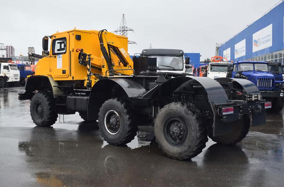 На опубликованных фотографиях новый тягач обут в дорожные покрышки. Однако в арктических и других экстремальных условиях машина будет эксплуатироваться на шинах низкого давления. Пилотный образец автозавод Урал построил в коллаборации с учеными и специалистами компании УЗСТ, которые разработали для автомобиля краново-манипуляторную установку. Серийное производство тягача начнется до конца 2025 года.