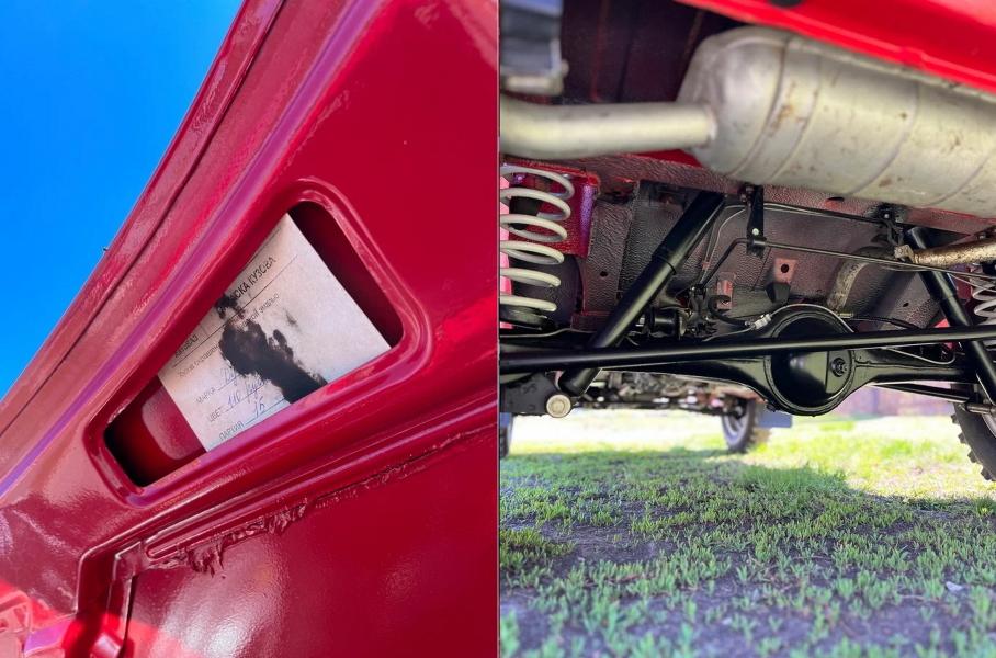 Из необычных артефактов — югославская авторемонтная эмаль, сервисная книжка с автографом создателя «Нивы», нетронутые ручной стартер и запаска. Техника абсолютно стандартная: под капотом атмосферный карбюраторный 1,6-литровый двигатель, тяга передается через механическую 4-ступенчатую коробку передач. Судя по пломбам, пассажирская дверь не открывалась вовсе.
