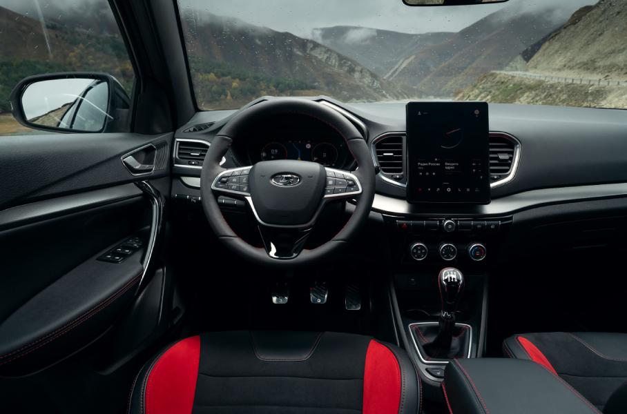 В основе такой Весты — комплектация Techno, в которую входит, кроме прочего, топовая мультимедийная система Lada EnjoY Vision Pro со встроенными сервисами Яндекса. Также в салоне с красно-черной отделкой имеются цифровая «приборка», анатомические кресла, кондиционер и подогрев передних сидений. Есть обогрев лобового стекла, камера заднего вида и задний парктроник.