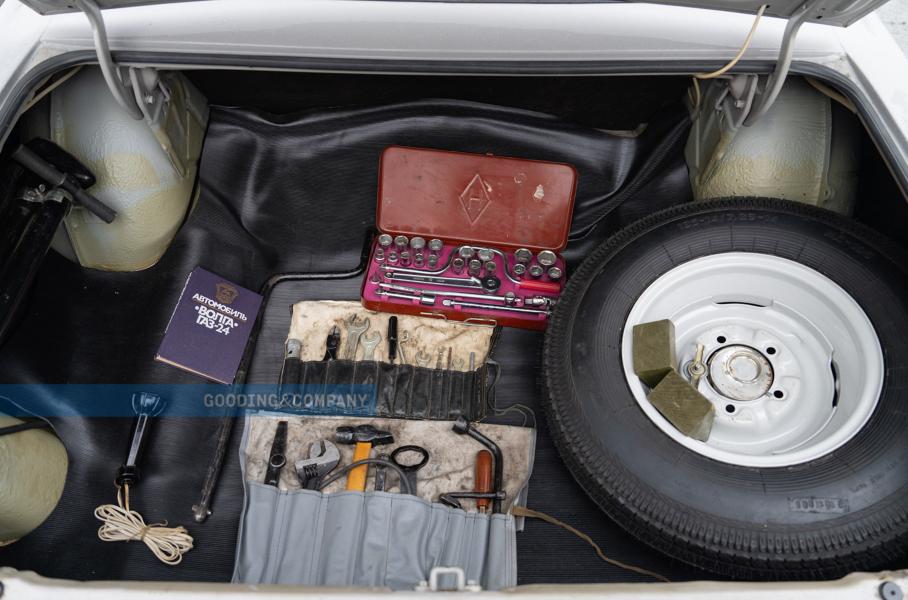 В комплекте с машиной отдают оригинальный набор инструментовСудя по фотографиям, лакокрасочное покрытие светло-серого цвета, а также красный тканевый салон «Волги» спустя 48 лет сохранились в отличном состоянии. Под капотом советского седана находится 2,4-литровый бензиновый двигатель мощностью 95 лошадиных сил. Агрегат укомплектован четырехступенчатой механической коробкой передач.