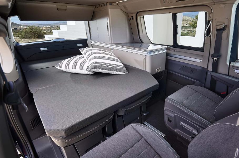 В трех самых дорогих версиях установили походную кухню с раковиной, плитой и множеством ящиков для хранения. Топовый California оборудовали дополнительными аккумуляторами для поездок на природу, складным столом, а также двумя 230-вольтовыми розетками и емкостью для питьевой воды. Большинством функций кемпера можно управлять с планшета, установленного в задней части салона.