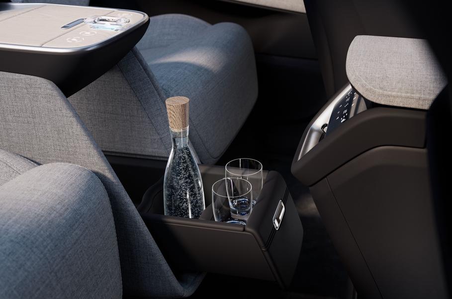 Поскольку это топ-версия, то для отделки салона использовали шпон натурального дерева и смесовую шерсть / текстиль Nordico, который получают из переработанных пластиковых бутылок, биосырья и пробкового дерева. Кристалл на разделяющей кресла консоли заведует ароматизатором с тремя разными запахами. Рычажок изготовлен фирмой Orrefors, шведским производителем посуды и декоративных предметов из хрусталя.