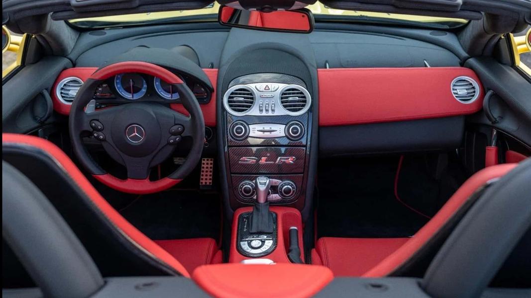 Родстер 2008 года с момента покупки хранился в сухом помещении и проехал менее сотни километров. Ярко-жёлтый кузов сочетается с красно-чёрной мягкой крышей, а салон отделан двухцветной кожей оттенков Classic 300 SL Red и Silver Arrow с тиснением SLR и контрастной чёрной прострочкой.
