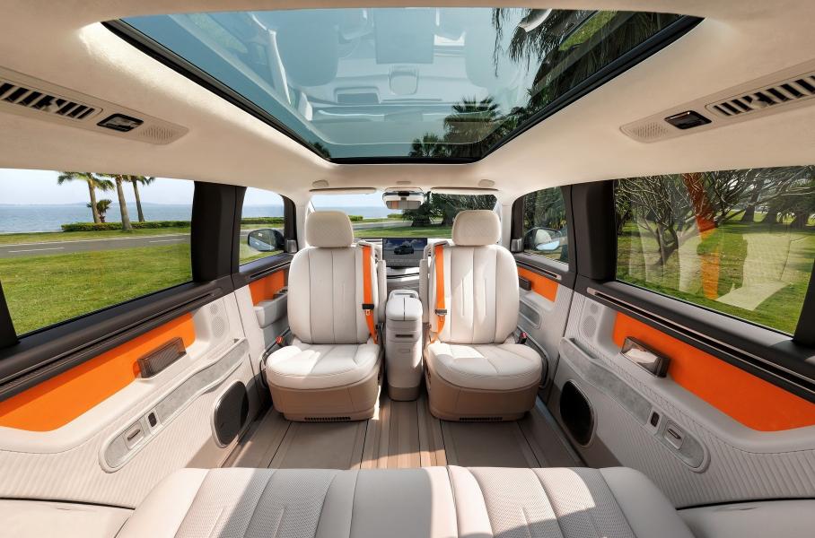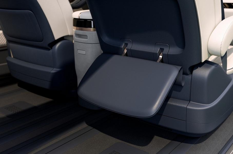 Автомобиль длиной 4,69 метра с трёхметровой колёсной базой бывает только пятиместным, но задний диван хитрый: предусмотрены оттоманки, подставки для ног, раскладные столики, есть подлокотники, вентиляция и подогрев всех сидений. Также среди опций панорамная крыша, проекционный экран, отделка кожей Nappa, камеры кругового обзора, автопарковщик и система контроля полосы.
